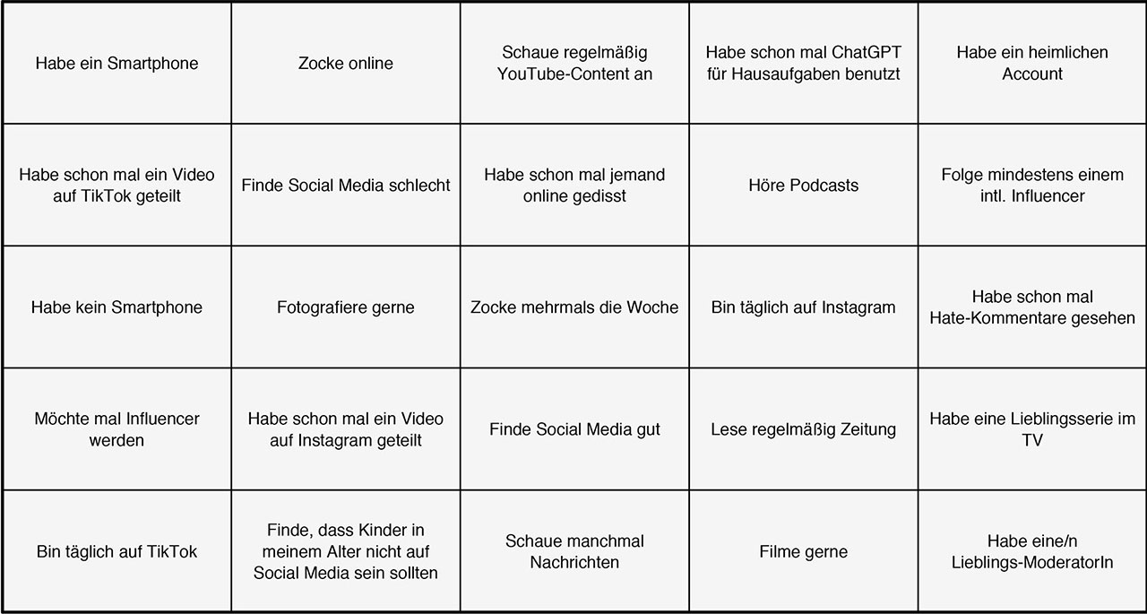 – Die Teilnehmer*innen laufen durch den Raum und befragen die anderen, ob eine Aussage auf der Bingo-Karte auf sie zutrifft.