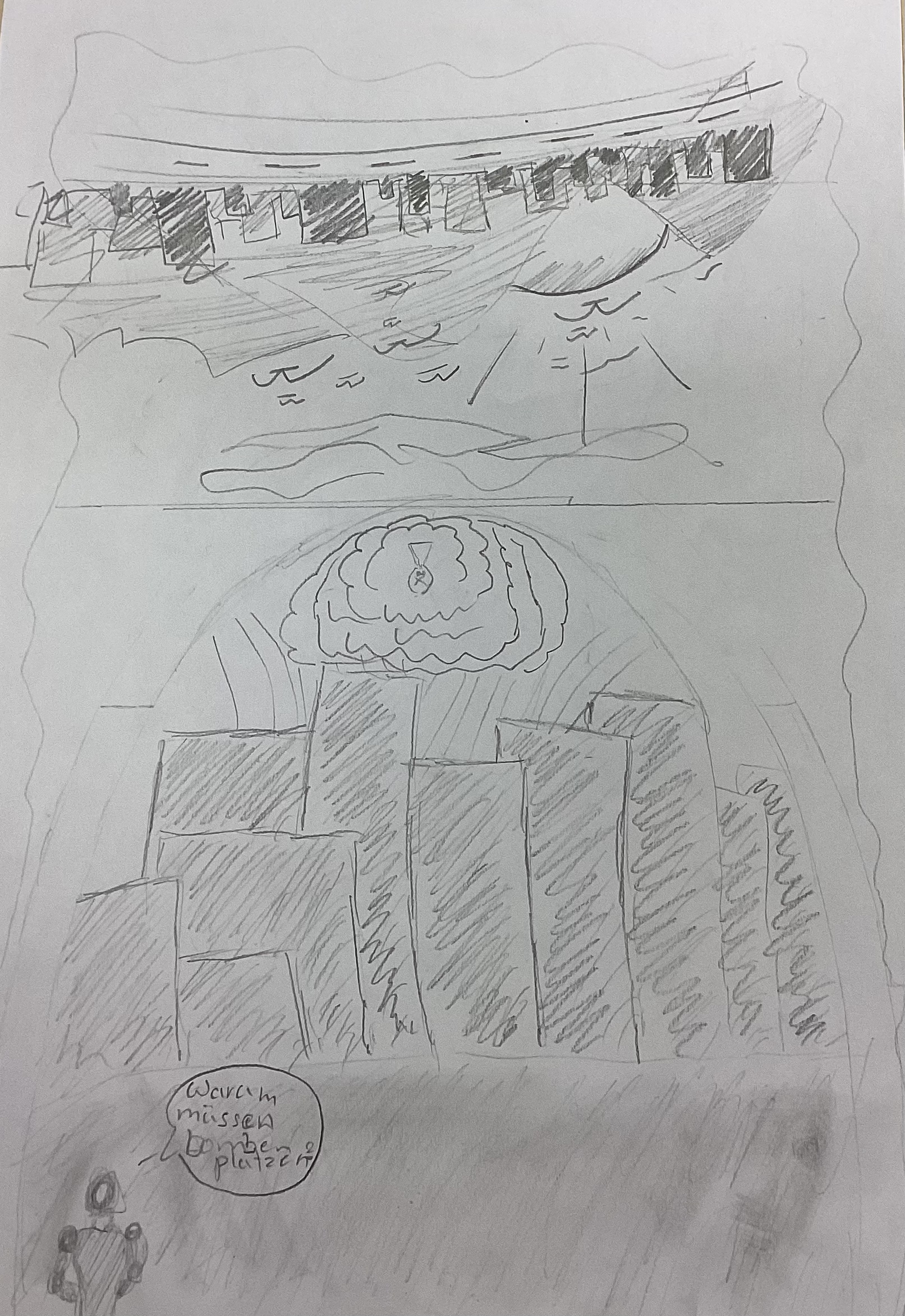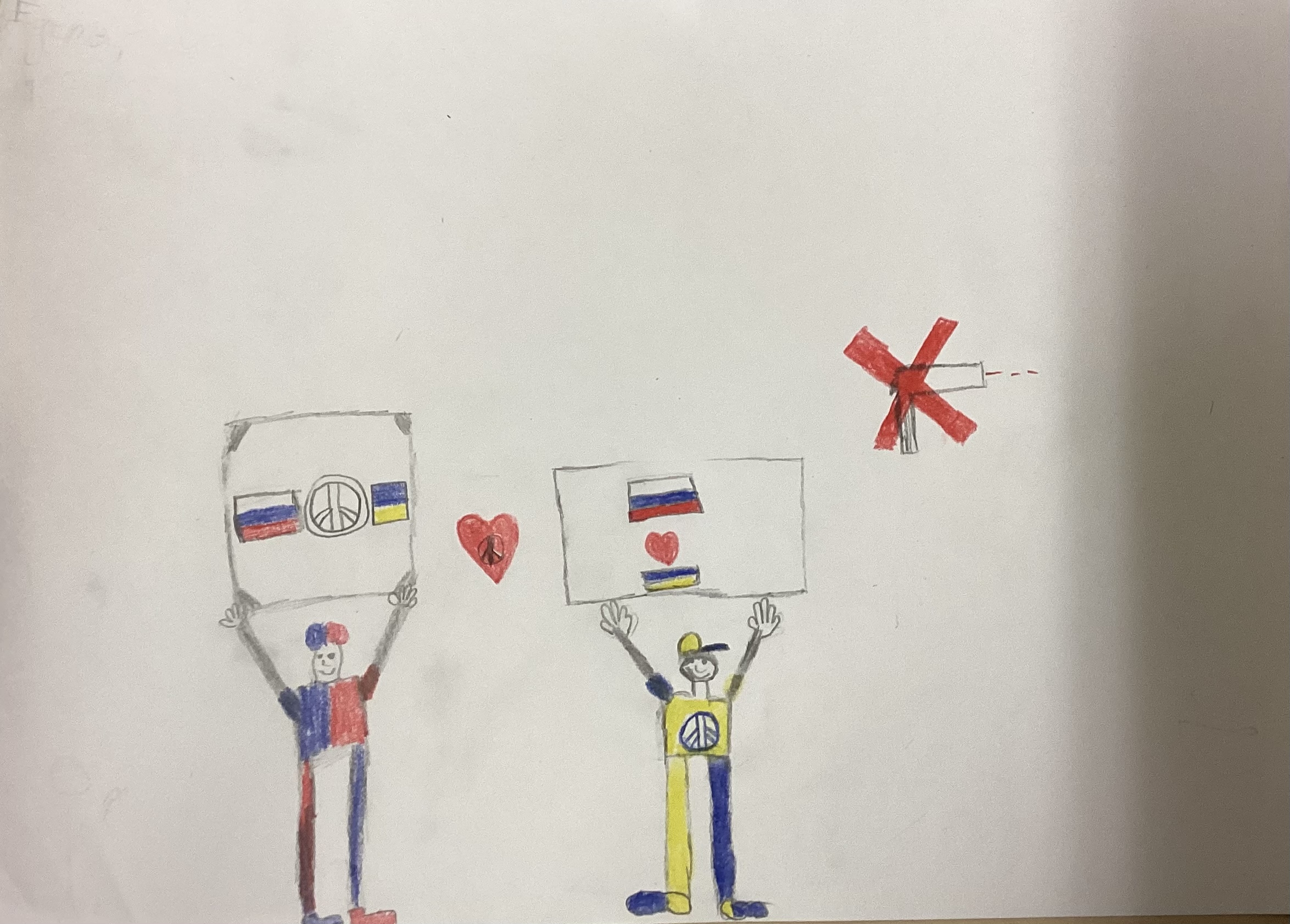 Wir möchten zeichnen, wie wir uns eine Welt ohne Krieg vorstellen beziehungsweise, wie sie aussehen könnte. Es ist zum Beispiel auch ein Wendebild dabei, wo auf der einen Seite eine friedliche Welt dargestellt wird und auf der anderen Seite eine grausame Welt mit Krieg.