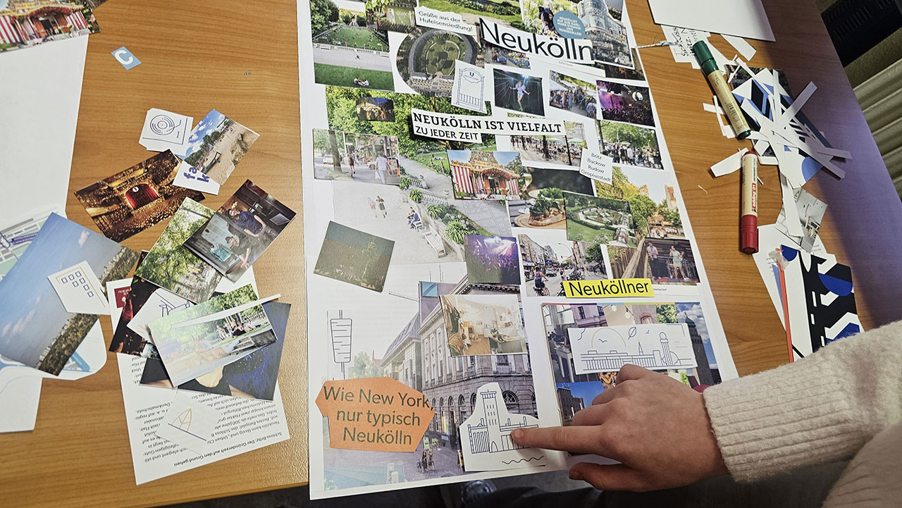 Für die Gestaltung des Plakats haben wir aus Broschüren viele Bilder und Schriftzüge aus Neukölln und über Neukölln ausgeschnitten und daraus eine Collage erstellt. Die Bilder wurden alle an verschiedenen Orten in Neukölln aufgenommen und stellen unserer Meinung nach Neukölln sehr gut dar. Sie zeigen beliebte Orte wie den Körnerpark oder die Karl-Marx-Straße, wo immer viel los ist.